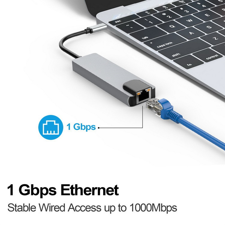 Адаптер USB3.1 Type-C – HDMI / 2x USB3.0 / USB-C / RJ45 позволяет расширить возможности USB3.1 Type-C порта и подключить Ethernet-соединение к Вашему компьютеру, ноутбуку или планшету через сетевой разъем RJ45 (до 100 Мбит/с). Порт HDMI предназначен для передачи изображения со смартфона, планшета, ноутбука или компьютера с порта USB-C на телевизор, монитор или проектор с входом HDMI. Конвертер позволяет дублировать или расширить пространство рабочего стола Вашего ПК или ноутбука на дополнительный монитор, телевизор, проектор. Также возможно подключение периферийных устройств: флешка, внешний жесткий диск, картридер, клавиатура, мышь, др. адаптер / хаб, web-камера, принтер, сканер, МФУ и т.п.