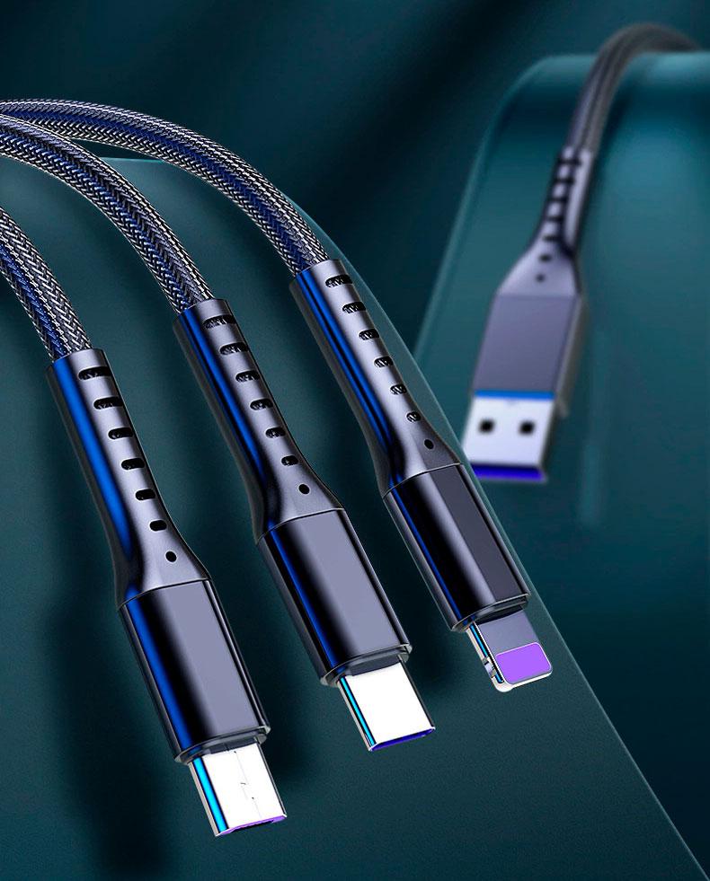 Универсальный зарядный кабель 3-в-1 USB Type-C - Lightning - MicroUSB, 5А, 1.2 метра, черный 556908