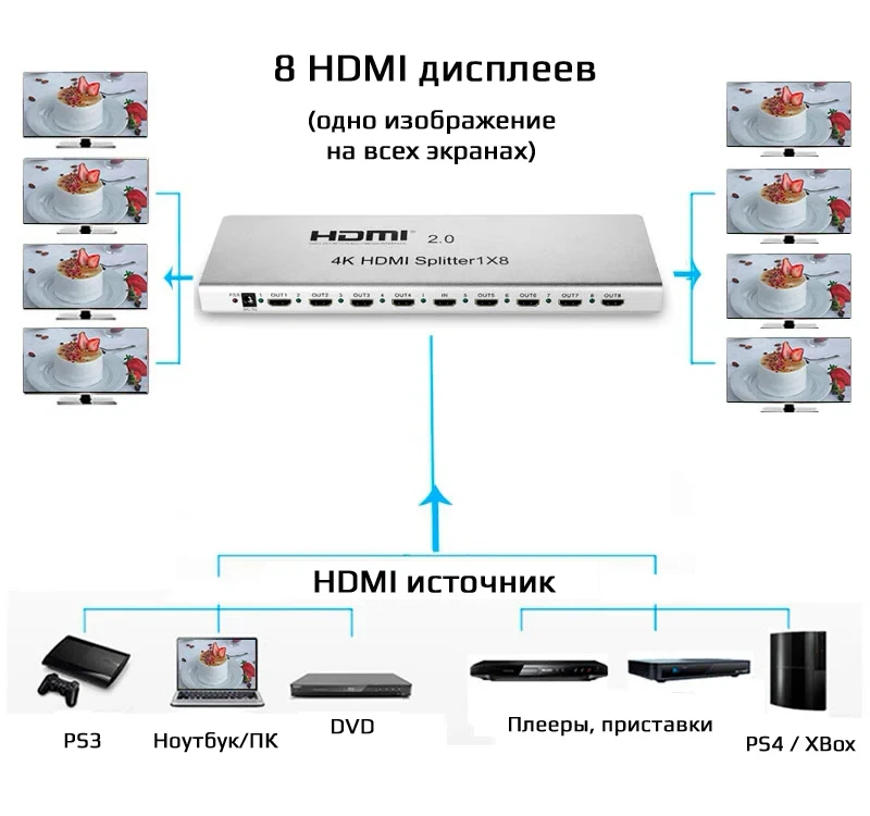 HDMI splitter совместим с большинством устройств, имеющих HDMI-интерфейс, включая DVD и Blu-ray проигрыватели, игровые консоли Xbox, Sony PS3/PS4, компьютеры, ноутбуки, телевизионные приставки и спутниковые ресиверы.