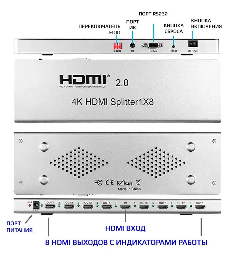 Разветвитель HDMI 8K@60Гц и 4K@120Гц — идеальное решение для дублирования HDMI-сигнала на восемь устройства, таких как телевизоры, мониторы и проекторы с высоким разрешением 8К (7680х4320). Сплиттер HDMI (хдми) — это полезное устройство, позволяющее легко и удобно управлять несколькими экранами с одного источника. Идеален для использования в домашних кинотеатрах, конференц-залах или учебных заведениях, где необходимо показывать один и тот же контент на нескольких экранах, так как выводит изображение с одного компьютера (ноутбука, Blu-ray плеера или игровой консоли) на несколько телевизоров или мониторов одновременно.