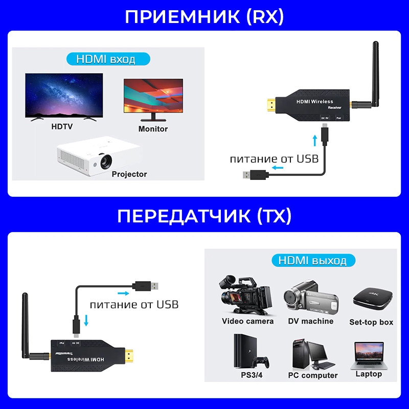 - Легкость установки: Установка не требует специальных навыков. Просто подключите передатчик к источнику сигнала и приемники к телевизорам или проектору — и вы готовы к работе!